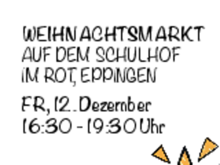 Am Freitag, den 12.12.2025 findet zwischen 16.30 Uhr und 19.30 Uhr, auf dem Schulhof der Grundschule im Rot in Eppingen ein Weihnachtsmarkt statt.