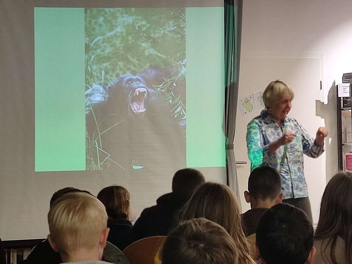 Sie verstand es gekonnt, die Kinder mit ihren Erzählungen über Jane Goodall in den Bann zu ziehen. Mucksmäuschenstill hingen die Kinder an ihren Lippen, während sie erfuhren, wie es dazukam, dass die junge Jane aus England schließlich im afrikanischen Dschungel landete und dort als Sekretärin des bekannten Forschers Luis Leakey das Leben und Verhalten der Schimpansen erforschte. Über 30 Jahre lebte sie gemeinsam mit den Affen.