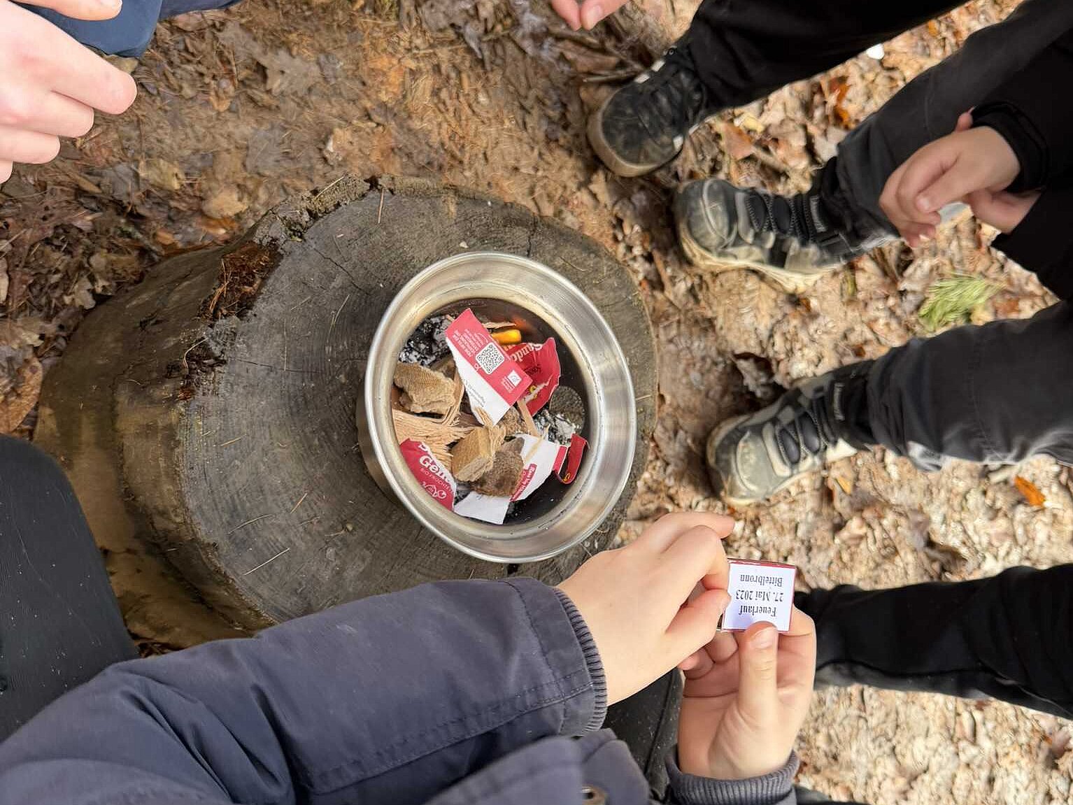 An der dritten Station wurde es praktisch und ein wenig abenteuerlich: Die Kinder durften selbst ein Feuer entzünden – mit Holz und Papier. Das war gar nicht so einfach, denn es brauchte Geduld, gutes Pusten und die richtige Anordnung der Holzstücke. Als es schließlich gelang, wurde ein Wasserkessel auf das Feuer gestellt.