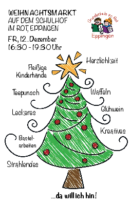 Am Freitag, den 12.12.2025 findet zwischen 16.30 Uhr und 19.30 Uhr, auf dem Schulhof der Grundschule im Rot in Eppingen ein Weihnachtsmarkt statt.